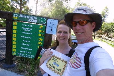 No mom, you don't have to worry, we were not in any danger at all. Today we went to the Australia Zoo, which is owned and operated by Steve and Terri Irwin, otherwise known as "The Crocodile Hunter". OK, so the guy is this big freak celebrity right? And he has GOT to be raking in some big bank right? And like any good business man you figure he is GOING to capitalize on that right? He is going to merchandise the heck out of himself right? And make a killing right? And live large right?
