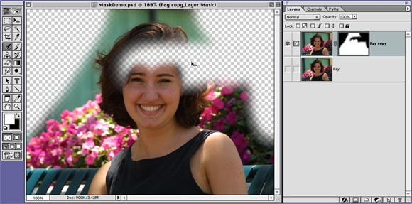 Notice here that the FOREGROUND COLOR is now White and not Black, as it was in the previous image. That means that to bring something back from the dead all you have to do is hit the "X" key on the keyboard, which swaps the Foreground and Background color and continue painting. When you are painting in White on the MASK you are allowing the image to be seen, when you are painting in Black you are hiding the image.